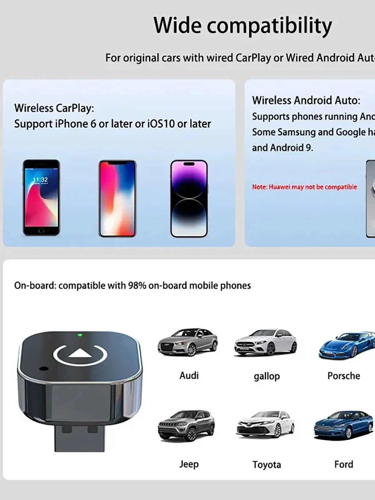 This adapter is only suitable for cars equipped with wired CarPlay or wired Android Auto original in-car touchscreen radio (Note: